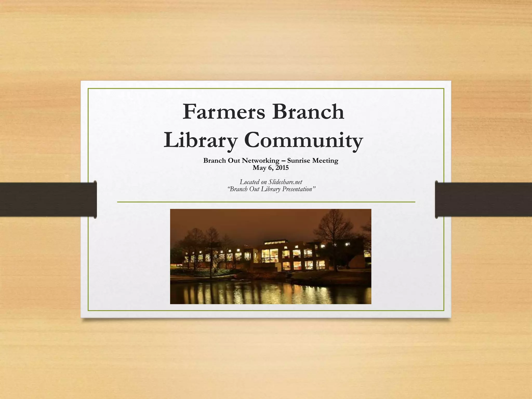 This document provides an overview of the history and resources of public libraries, with a focus on the Farmers Branch Library. It discusses how Thomas Jefferson advocated for small local libraries, and how the Library of Congress was established in 1800 and rebuilt after being destroyed in 1814. The document outlines the benefits of public libraries in providing free access to information, technology, education, and community resources. It highlights the meeting spaces, databases, materials, and programs available at the Farmers Branch Library.