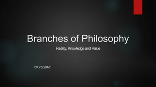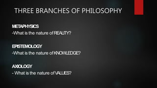 This document outlines several major branches and traditions of philosophy. It discusses metaphysics, epistemology, and axiology as the three main branches of philosophy concerned with reality, knowledge, and values respectively. It then summarizes some of the key ideas and proponents of major philosophical traditions like idealism, realism, neo-Thomism, pragmatism, existentialism, and analytic philosophy.