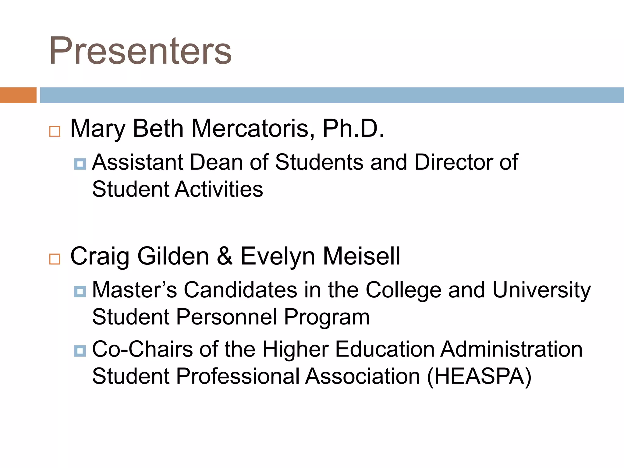This document outlines how graduate students in higher education administration can benefit campus departments through internships. It highlights factors influencing internship site selection, shared experiences, and common challenges faced by interns. The authors offer recommendations for supervisors to enhance the internship experience and encourage collaboration with the HEASPA organization.