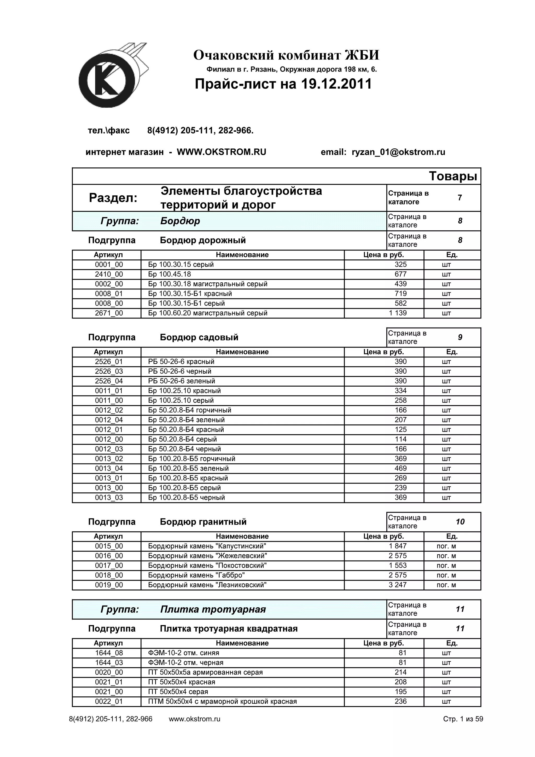 Документ содержит прайс-лист Очаковского комбината ЖБИ в Рязани, действующий с 19.12.2011, и включает ассортимент товаров, таких как бордюры и тротуарная плитка, с указанием артикулов, наименований и цен. Прайс-лист включает детальную информацию по различным подгруппам и категориям товаров. Контактная информация комбината и ссылка на интернет-магазин также представлены в документе.