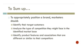This document discusses customer-based brand equity (CBBE) and how to establish strong brand positioning. It defines CBBE as the differential effect that brand knowledge has on consumer response to marketing for that brand. Brand equity can be positive if consumers react more favorably to a branded product, or negative if they react less favorably. The document outlines how to measure brand awareness and image as components of brand knowledge that drive brand equity. It also provides guidelines for identifying the target market and competitors to determine appropriate points of parity and points of difference for brand positioning. Overall the document provides a framework for understanding how to analyze brands from the consumer perspective and strategically position a brand.
