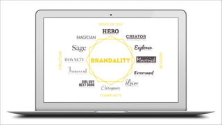 The document discusses how brands can use archetypes to connect with customers on a deeper level. It introduces 12 common brand archetypes like Innocent, Hero, Explorer, and explains how brands can identify their own archetype. The document then provides tips on how to leverage a brand's archetype, including how to incorporate it into marketing messages, website content, social media, and more. It emphasizes the importance of consistency and staying true to the brand's core values and purpose. The document encourages brands to conduct an "archetype audit" to ensure all aspects of the brand are aligned and conveying the same personality.