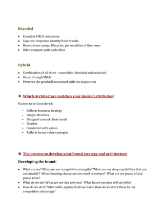 Brand architecture is the structure of brands within a company and how they relate to each other. It defines hierarchies and how sub-brands support or detract from corporate brands. Brand architecture should be fluid to leverage maximum value as markets change rapidly. There are different types of architectures including monolithic, endorsed, and branded. Developing an effective brand architecture is a process that involves auditing brands, defining brand essences, considering strategic fit, and engaging designers to create visual expressions. An important role is the brand architect, who bridges strategy and expression by providing innovative brand solutions.