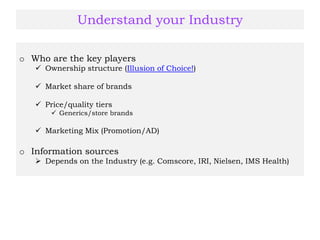 1) Understanding industries and competitors to analyze market share, price tiers, and marketing strategies.