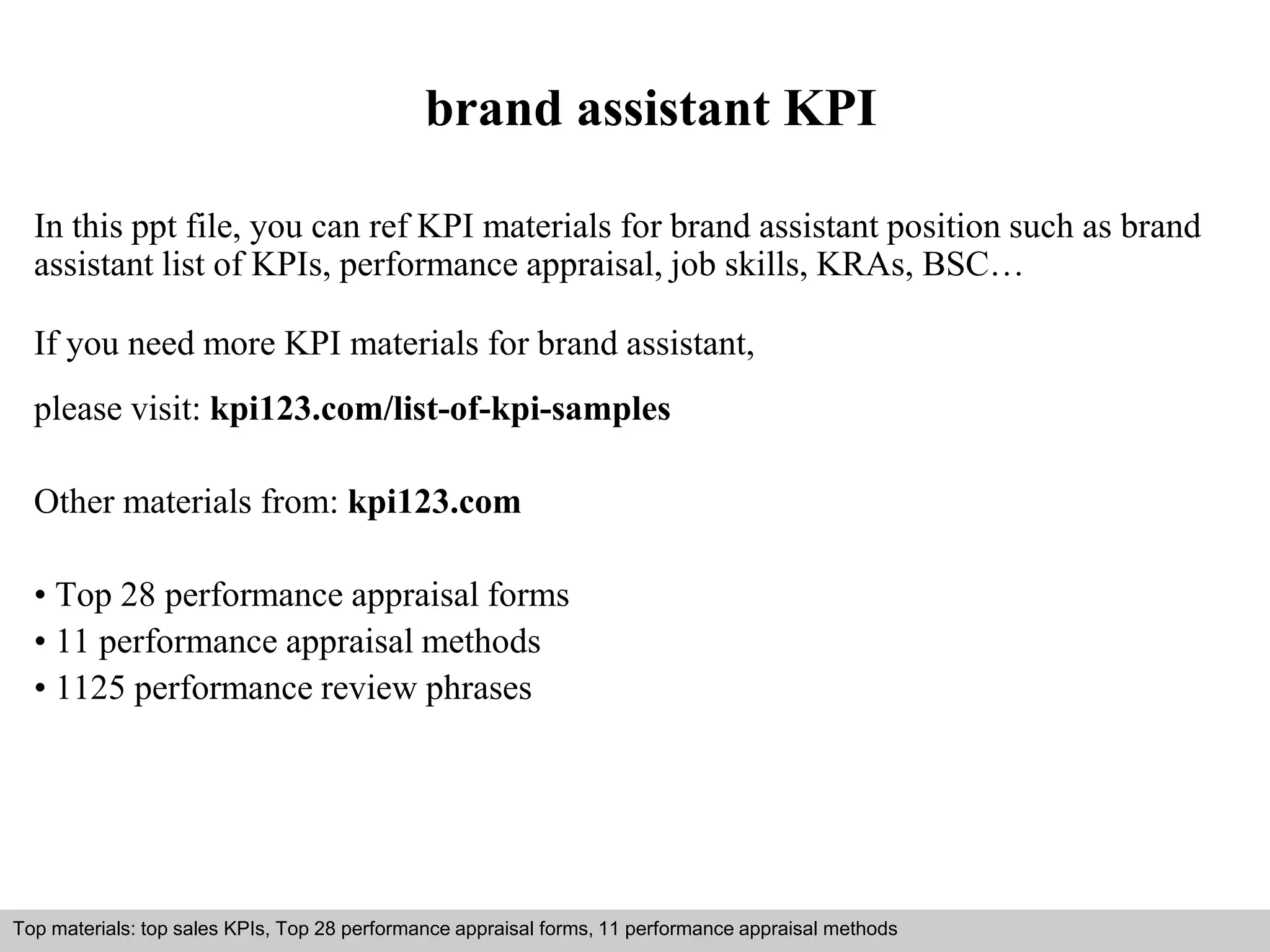 This document discusses key performance indicators (KPIs) for a brand assistant position. It provides examples of KPI materials that can be referenced, including lists of KPIs, performance appraisals, job skills, and key result areas. It also gives the steps to create KPIs for a brand assistant, including defining objectives, identifying key result areas and tasks, determining work procedures, and creating measures. Finally, it discusses mistakes to avoid when building KPI systems and how to design brand assistant KPIs by linking them to strategy and empowering employees.