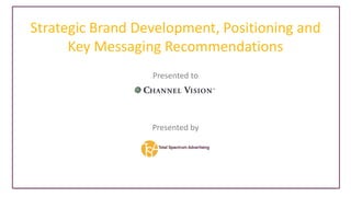 The document presents a strategic overview of brand development and positioning recommendations for Channel Vision, detailing strengths and weaknesses identified through competitive reviews and dealer surveys. It highlights the importance of strong branding in differentiating products, building consumer trust, and enhancing perceived value while addressing specific challenges faced by the brand in terms of recognition and market presence. Key messaging and product family clarification are suggested to strengthen brand visibility and market effectiveness.