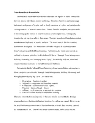 The document discusses the brand management of emmetlabs, an online wiki platform meant for exploring and creating connections. It critiques the existing brand name and elements, suggesting changes for better memorability and description of the site's functions. Recommendations include altering the brand name, logo, tagline, and developing additional branding elements to enhance visibility and user engagement.