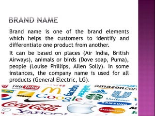 The document defines various brand elements such as brand names, logos, brand personality, and slogans, which help distinguish products in the marketplace. It emphasizes the significance of sound branding through jingles and the appropriate use of URLs in branding materials. Additionally, it highlights the role of packaging in building brand equity by fulfilling multiple objectives related to product identification and consumer interaction.