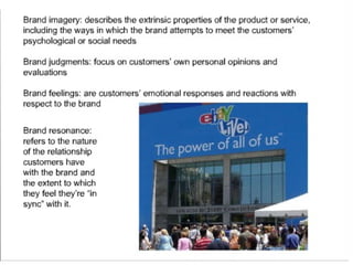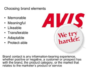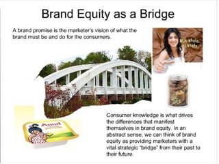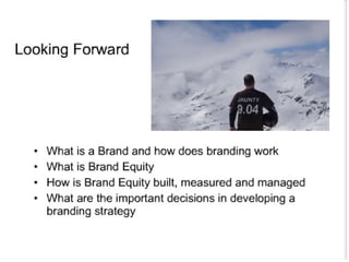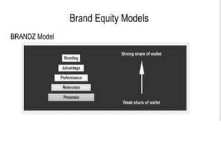 This document discusses branding and brand equity. It defines branding as endowing products with a brand to create differences between products. Brand equity is the added value provided to products and services by a brand. The Aaker model identifies five categories of brand assets and liabilities that contribute to brand equity: brand loyalty, brand awareness, perceived quality, brand associations, and other proprietary assets. The brand resonance model shows how brand identity, meaning, response, and relationships build brand resonance. Methods for measuring brand equity include brand audits, brand tracking, and brand valuation. Managing brand equity involves brand reinforcement, handling brand crises, brand extensions, and developing brand portfolios.