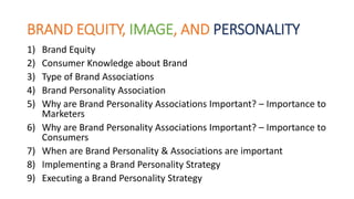 The document discusses brand equity, image, and personality, highlighting their importance to both marketers and consumers. It emphasizes the role of brand personality associations in defining consumer perceptions and creating loyalty, as well as strategies for implementing and executing a brand personality. Key points include how brand equity enhances consumer confidence and the significance of aligning brand personality with consumer self-concept.