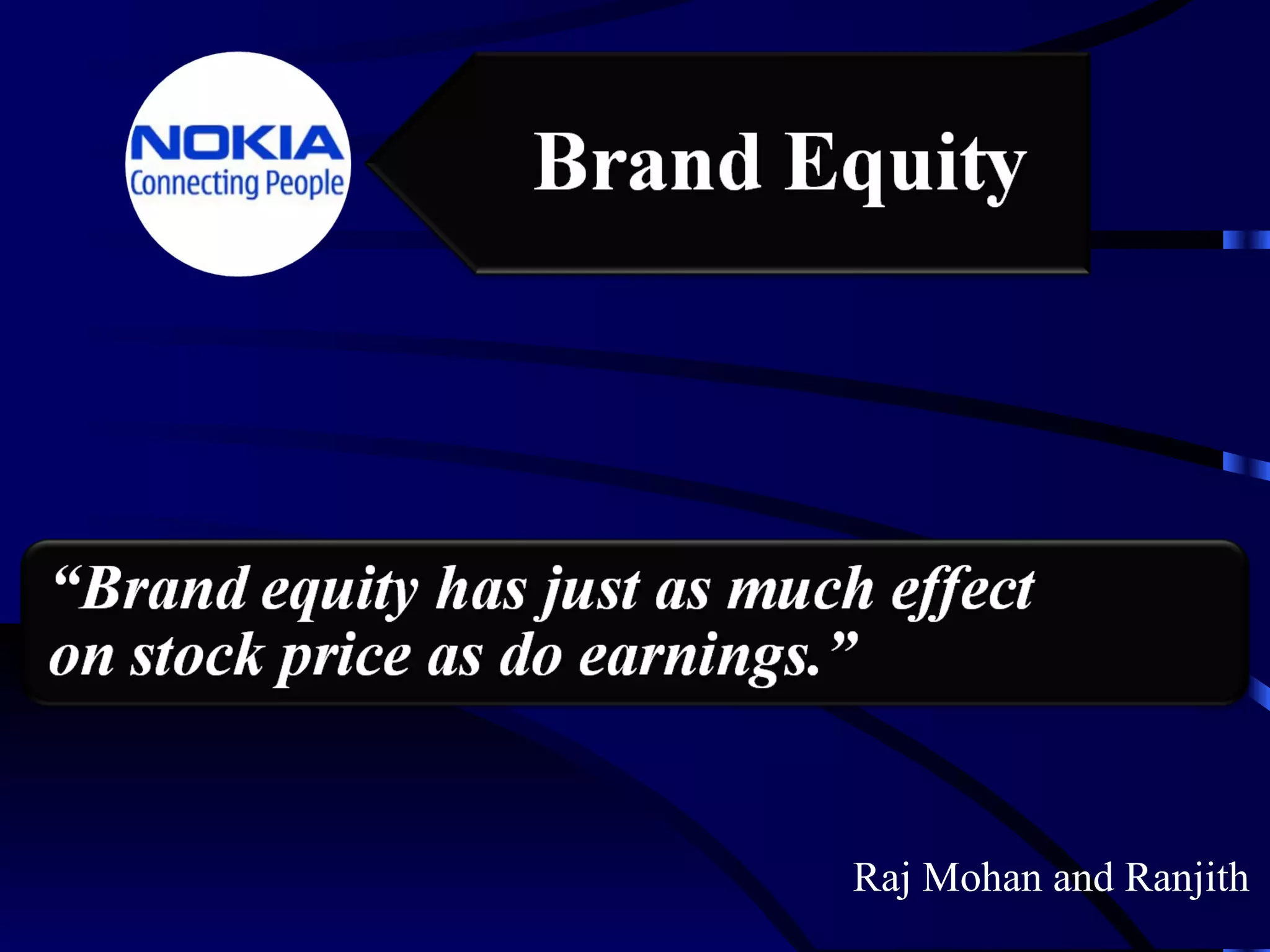 The document discusses brand equity and how it is viewed from the perspectives of consumers and manufacturers. It defines brand equity as the added value endowed to products and services through positive consumer perception and experience with the brand over time. This value is reflected in consumer behavior and financial performance for the brand. The document also examines several models for measuring and evaluating brand equity, including brand assets, awareness, loyalty, and consumer perceptions that contribute to brand value. It explores approaches for reinforcing, tracking, and sustaining brand equity over the long run.