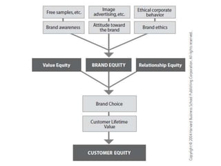 The document discusses the importance of customer-centric approaches in brand management, emphasizing that brands should serve customers rather than the other way around. It highlights case studies, such as General Motors' struggles with the Oldsmobile brand, to illustrate the need for marketers to focus on customer relationships and equity over brand loyalty. By understanding consumer behavior and preferences, companies can better adapt their branding strategies to meet the true desires of their customers.