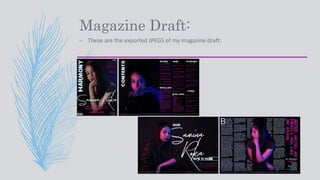 The document provides guidelines for a magazine draft, including discussions of cover lines, color scheme, tone, and conclusion. It summarizes the choices made for the magazine, such as using three cover lines based on research of other magazines in the genre. The color scheme was selected to reflect the target female audience and indie R&B genre rather than being too conventional. Photos were taken with gel lighting to link the images and colored text while also conveying the feeling of a concert. Overall, the document discusses how genre conventions and codes were considered and adapted to provide a refreshing take for the target readers.