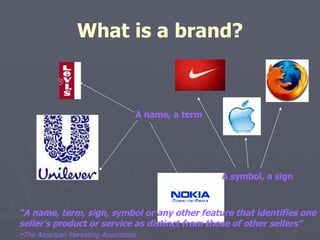 Brand image is defined as the unique set of associations in customers' minds about what a brand stands for and the promises it implies. It is shaped by interactions between the firm, customers, and brand identity as framed by marketers. A brand is created through continuously developing relationships where customers form differentiated impressions of products and services based on brand exposures. Company image refers to perceptions of the organization itself among various stakeholders, while brand image is specific to products and services. Managing brand image requires understanding how customers experience and perceive the brand.