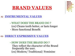 The document discusses what constitutes a brand and how brands are built. It defines a brand as a combination of what the product is, what customer needs it meets, and the values customers associate with it. A genuine brand is uniquely perceived by customers based on functional and emotional benefits. Modern branding involves differentiating the brand, making it relevant, building esteem, raising awareness, and positioning it strongly in customers' minds. Brand elements like names, logos and slogans are used to identify and distinguish a product from others.