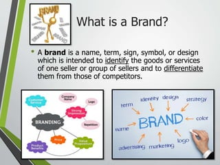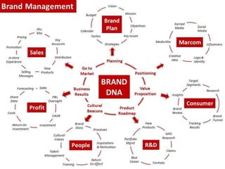The document discusses key concepts in brand management including defining a brand, the importance of branding, the brand management process, challenges in brand management, and Keller's Customer-Based Brand Equity model which identifies the steps of establishing brand identity, brand meaning, brand response, and brand relationships to build strong brand equity. It provides examples of different strategies for positioning a brand including using product attributes, technology, benefits, user categories, in relation to competitors, or as an integrator.
