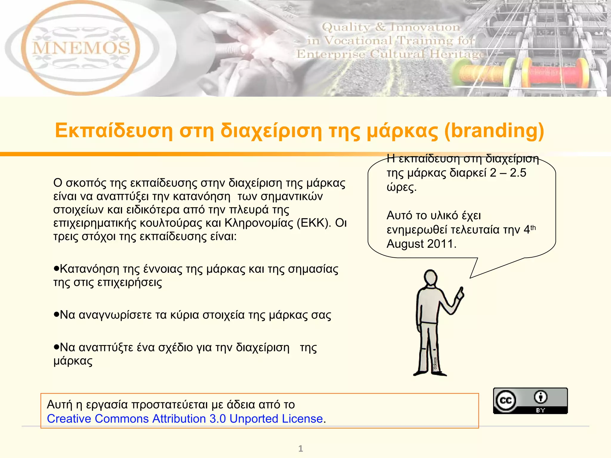 Εκπαίδευση στη διαχείρισητης μάρκας ( branding) Ο σκοπός της εκπαίδευσης στην διαχείριση της μάρκας είναι να αναπτύξει την κατανόηση των σημαντικών στοιχείων και ειδικότερα από την πλευρά της επιχειρηματικής κουλτούρας και Κληρονομίας (ΕΚΚ) . Οι τρεις στόχοι της εκπαίδευσης είναι: Κατανόηση της έννοιας της μάρκας και της σημασίας της στις επιχειρήσεις Να αναγνωρίσετε τα κύρια στοιχεία της μάρκας σας Να αναπτύξτε ένα σχέδιο για την διαχείριση της μάρκας Η εκπαίδευση στη διαχείριση της μάρκας διαρκεί 2 – 2.5 ώρες . Αυτό το υλικό έχει ενημερωθεί τελευταία την 4 th August 2011. Αυτή η εργασία προστατεύεται με άδεια από το Creative Commons Attribution 3.0 Unported License .