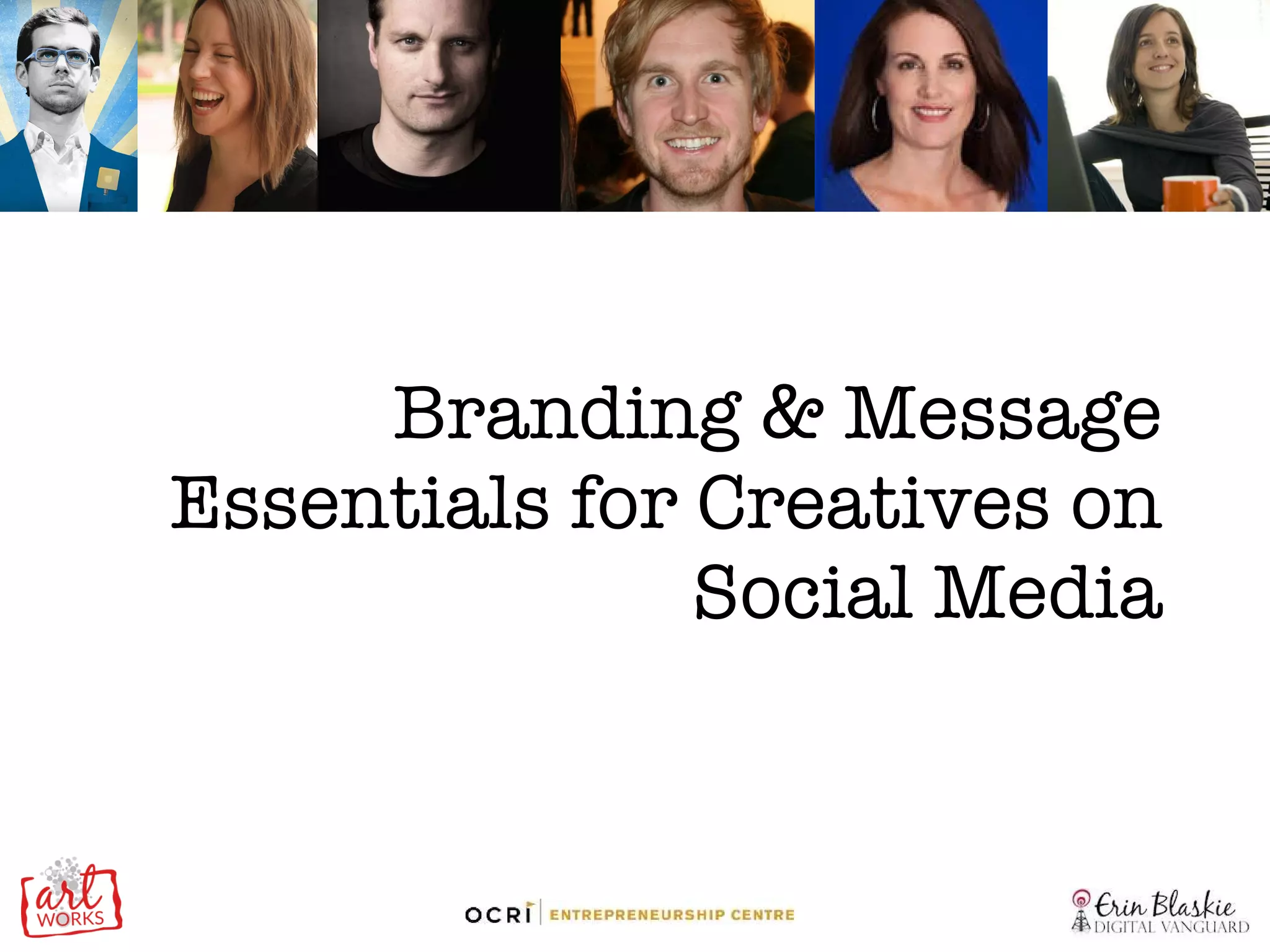 Erin Blaskie discusses branding and messaging essentials for creatives on social media, emphasizing the importance of understanding one's 'why' for engaging on these platforms. She encourages artists, who often resist social media, to embrace it as a means of sharing their work and connecting with audiences. The document outlines the need to choose appropriate platforms and develop a strategic plan for content sharing that reflects one's brand.
