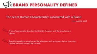 Brand personality refers to human-like traits attributed to a brand, such as honesty and reliability, and is crucial for consumer relatability and brand equity. It is formed through various factors including product attributes, marketing strategies, and endorsements. Iconic Indian brands like Amul, Thums Up, Mahindra, Tanishq, and Royal Enfield exemplify different brand personalities, showcasing traits ranging from sincerity to ruggedness.