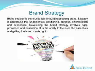 The document outlines the importance of brand strategy as the foundation for establishing a strong brand, emphasizing elements such as positioning, purpose, and differentiation. It explains that brand positioning is crucial for businesses to succeed in a competitive marketplace, guiding all brand activities towards common goals. Additionally, the document highlights the need for a strategic approach to understand market context and consumer perceptions to achieve effective brand positioning.