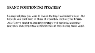 This document discusses brand positioning strategies for several brands including Vicks Vaporub, Maggi noodles, Colgate, and Surf Excel. It explains how each brand has positioned itself in the market through defining benefits and attributes. For example, it notes that Vicks Vaporub has been synonymous with "khich-khich" in India. Maggi positioned as a 2-minute noodle that is easy to cook and healthy. Colgate focused on oral hygiene through partnerships with dentists. Surf Excel was initially positioned on whitest washing but later focused on saving water and promoting learning through stains. The document emphasizes how effective positioning can maximize brand value and customer relevance.