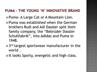 The document provides information on the logos of several major brands including Puma, Armani, Starbucks, Walmart, YouTube, and Ford. It discusses the origins and evolution of each company's logo over time. Key details include that Puma was founded in 1948 after the split of the Dassler brothers' shoe company, the Armani logo varies for each sub-label but features a curved "G" and "A", and Starbucks' logo maintains its history and tradition while keeping a simple yet stylish design.