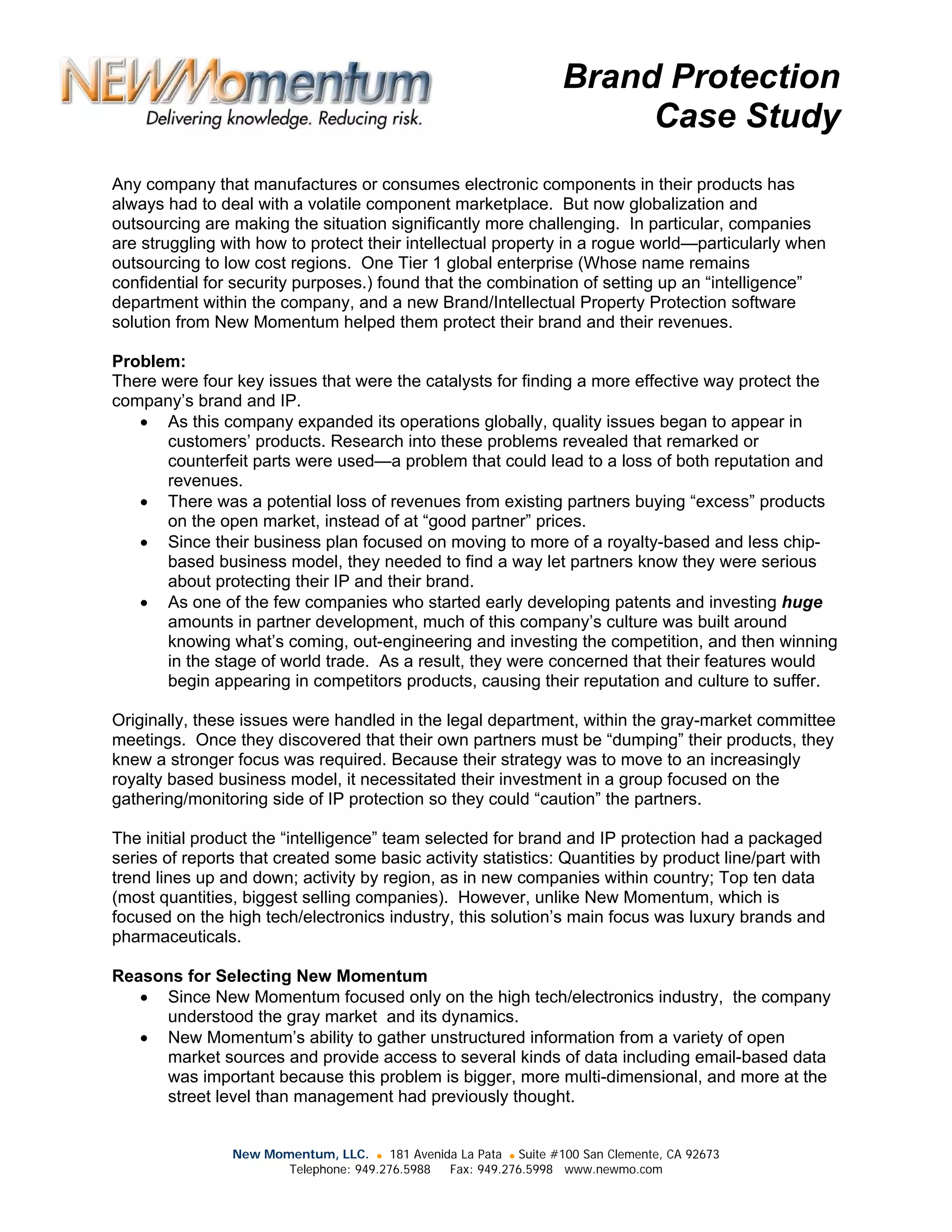 A global enterprise faced challenges in brand protection and intellectual property due to global expansion and quality issues related to counterfeit components. They implemented a new brand protection software from New Momentum, which focused on gathering unstructured market data effectively. This solution enabled them to identify unauthorized sales, address compliance among partners, and ultimately protect their brand and revenue through ongoing monitoring and analysis.