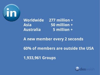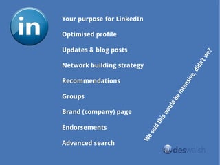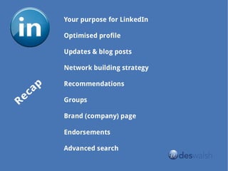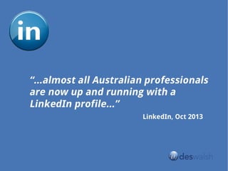 The document is a presentation promoting the use of LinkedIn for brand enhancement, specifically at an event in Gold Coast on March 30, 2014. It includes disclaimers about the presenter's relationship with LinkedIn and provides resource links related to the presentation. Contact information for the presenter, Des Walsh, is also included.