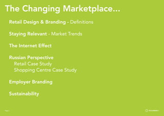 The document discusses the importance of design, branding, and commercial success in a changing retail marketplace, emphasizing the need for a sustainable strategy to differentiate brands and capture customer loyalty. It highlights the impact of e-commerce, consumer behaviors, and the evolution of branding strategies, particularly in the context of the Russian market. Additionally, it includes case studies and insights on retail design that create memorable customer experiences while addressing operational and market challenges.