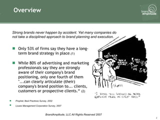 The document provides an overview of a brand strategy toolkit that is designed to help marketers and students create and implement effective brand strategies. It defines brand strategy as a plan to systematically develop a strong, coherent brand to enhance revenue and profits. The brand strategy process involves conducting a brand audit, analyzing target audiences, developing brand positioning, crafting a brand personality, and creating an integrated marketing communications strategy to ensure consistency across touchpoints.