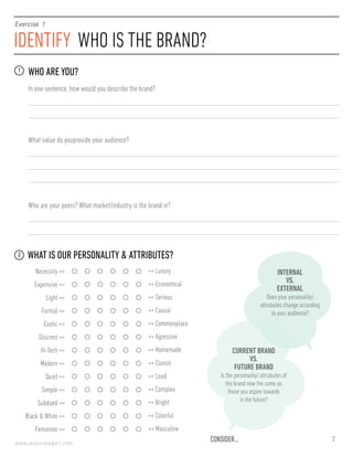This document provides a structured worksheet for conducting a brand strategy workshop, aiming to help participants define their brand attributes and strategies. It includes exercises to assess the current brand perception, desired future identity, and action steps for improvement. The facilitator is advised to use collaborative techniques and keep a master document of agreed answers.