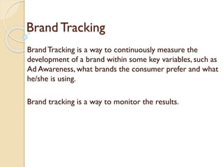 This document discusses brand tracking, which is a way to continuously measure how key variables related to a brand are developing over time. These variables can include brand awareness, preference, and usage. The document provides examples of questions that can be asked in a brand tracking interview or survey to measure these variables. It discusses tracking product brands, corporate or family brands, and brands globally. Brand tracking data can show the top of mind and in mind brands for awareness, preference, latest purchases, and advertisement awareness. This allows brands to monitor their performance and the consumer consideration set over time.