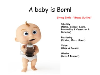 This document outlines a 7-step process for building a brand and public relations strategy inspired by the life stages of being born and growing up. It begins with establishing the brand outline by defining its identity, positioning, vision, and mission. The next steps include developing the brand's core values through nurturing influences, education and mastering skills. This is followed by marketing communications, public relations, promotion and engagement activities. The process culminates with brand extensions to new products and achieving brand credentials through commitment and fulfillment. The overall approach is presented as an analogy to the stages of human life.