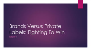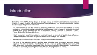 This document summarizes the history and rise of private label products compared to manufacturer brands. It discusses how in the 20th century, manufacturer brands dominated the market through quality products and mass advertising. However, in the late 20th century, retailers started developing national chains and began producing their own private label products to differentiate themselves and gain bargaining power over suppliers. The document then outlines the benefits and types of private labels, as well as strategies manufacturer brands can use to compete against the growing private label threat.