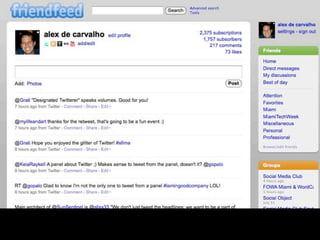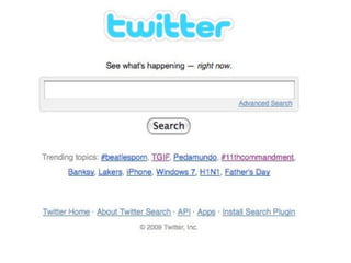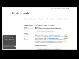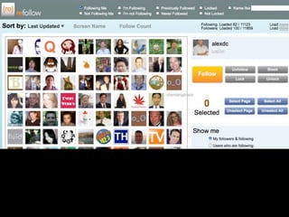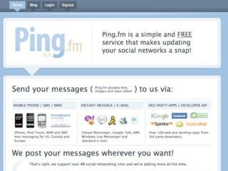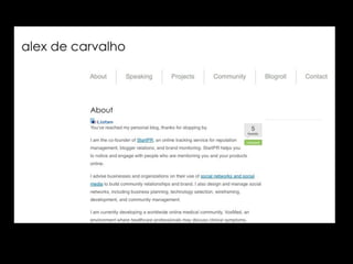 The document discusses the importance of personal branding online, emphasizing strategies for effective self-marketing and networking. It highlights various communities and tools available for individuals to enhance their online presence and connect with like-minded individuals. Additionally, it outlines methods for content creation and sharing, as well as the benefits of weak social ties in information dissemination.