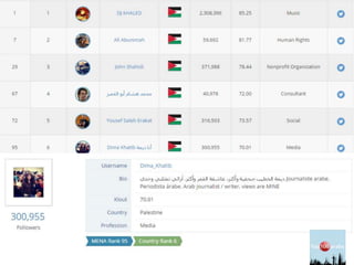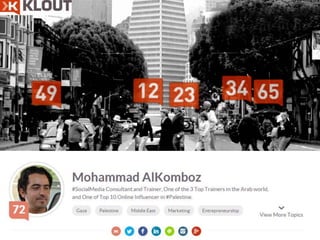 The document provides strategies for branding yourself online including creating a bio, conducting a SWOT analysis, and defining objectives and values. It discusses managing social media channels, developing a networking list, and using a content strategy where 90% of content is related to your field and 10% to other domains. The document also outlines standards for influencers including engagement, impressions, and reach. It identifies 4 levels of influencers from celebrities to friends and their relative reach and influence.