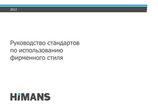 Документ представляет собой руководство стандартов по использованию фирменного стиля для компании 'Himans', включающее описание логотипа, цветовую гамму, шрифтовую гарнитуру и основные элементы фирменного стиля. Он также содержит указания по недопустимому использованию логотипа, а также рекомендации по созданию рекламных макетов и визитных карточек. Основная цель документа - обеспечить единообразие в использовании корпоративных элементов на различных платформах и материалах.