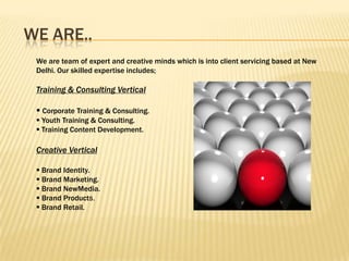 BrandCoach is a client servicing team based in New Delhi, specializing in corporate and youth training, brand identity, marketing, and consulting. They focus on helping organizations enhance staff skills, boost morale, and improve productivity through customized training programs linked to business objectives. The company distinguishes itself with a unique methodology and a resource pool of over 75 specialists, having worked with notable brands both in India and abroad.