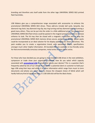Branded USB drives are an effective promotional product as they provide functionality while spreading brand awareness. There are several customization options for USB drives, including full-color printing, laser engraving, screen printing, and embossing. Accessories like key rings, lanyards, and magnetic packaging boxes can be added. When choosing the capacity for a promotional USB drive to hand out at events, a 1GB drive is recommended over smaller 64MB drives, as it can store meaningful amounts of data and ensure the drive remains useful.