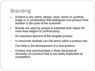 Branding is important for distinguishing products and establishing status. A brand represents the value delivered to customers and builds loyalty. Strong brands are integrated within organizations and drive shareholder value. Key branding elements include the name, position, promise, personality, tone, story and associations. Branding strategies include product, line, range and umbrella branding. Brand management involves marketing programs to build and maintain brand equity through product, price, distribution and communications. New challenges for brands include consumer simplification needs, increased competition and complex portfolios.