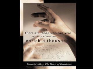 The document discusses the importance of branding and positioning for companies and institutions. It provides details of a case study where a marketing agency worked with Nazareth College to develop a new positioning statement and branding. Through research, they determined Nazareth produces civic-minded graduates but is misunderstood in the community. The new positioning positions Nazareth as developing energetic citizens with strong values who improve society through critical thinking and service.