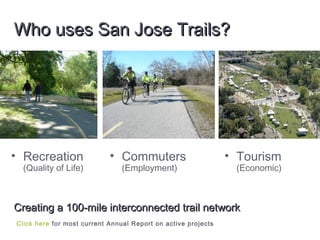 The document discusses San Jose's trail development program and its goals of creating a 100-mile interconnected urban trail network. It aims to establish 500 miles of bike facilities by 2022, including 400 miles of on-street bikeways and a 100-mile network of off-street trails, of which 55 miles have been completed so far. The vision is for San Jose to become the national leader for trail integration in urban environments through innovation, data, quality, access, partnerships, and pace of development.
