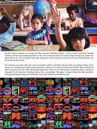 This document emphasizes the importance of branding and marketing for startups, encouraging them to start the branding process early, despite limited resources. Successful branding helps distinguish a business from competitors, attract customers, and engage investors and partners. The author presents key principles and tactics for effective branding, including focus, differentiation, authenticity, and using customer testimonials.