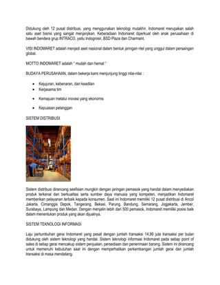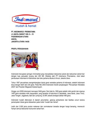 Indomaret adalah jaringan minimarket di Indonesia yang menyediakan kebutuhan sehari-hari dengan lebih dari 3.500 jenis produk dan tersebar di 3.448 gerai, termasuk gerai waralaba. Dikelola oleh PT Indomarco Prismatama, Indomaret telah meraih berbagai penghargaan dan memanfaatkan teknologi untuk efisiensi operasional dan pelayanan. Visi perusahaan adalah menjadi aset nasional dengan menawarkan sistem waralaba yang menguntungkan bagi masyarakat.
