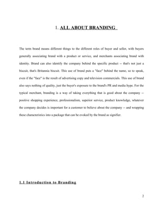 The document provides an overview of branding, including definitions of key branding concepts and strategies for building an effective brand identity. It discusses the purpose of branding, tools for developing brand identity such as slogans, colors and logos. It also addresses measuring brand effectiveness and the relationship between brands and reputation. The document contains sections on branding introduction, brand identity, brand equity and case studies of well-known brands.