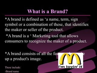 What is a Brand? *A brand is defined as ‘a name, term, sign symbol or a combination of these, that identifies the maker or seller of the product.  *A brand is a ‘ Marketing tool that allows consumers to recognize the maker of a product. *A brand consists of all the features that make up a product's image.  These include: -Brand name -Logo (visual association to the brand) -Slogan (a short catchy phrase that is always attached to the company name and logo)
