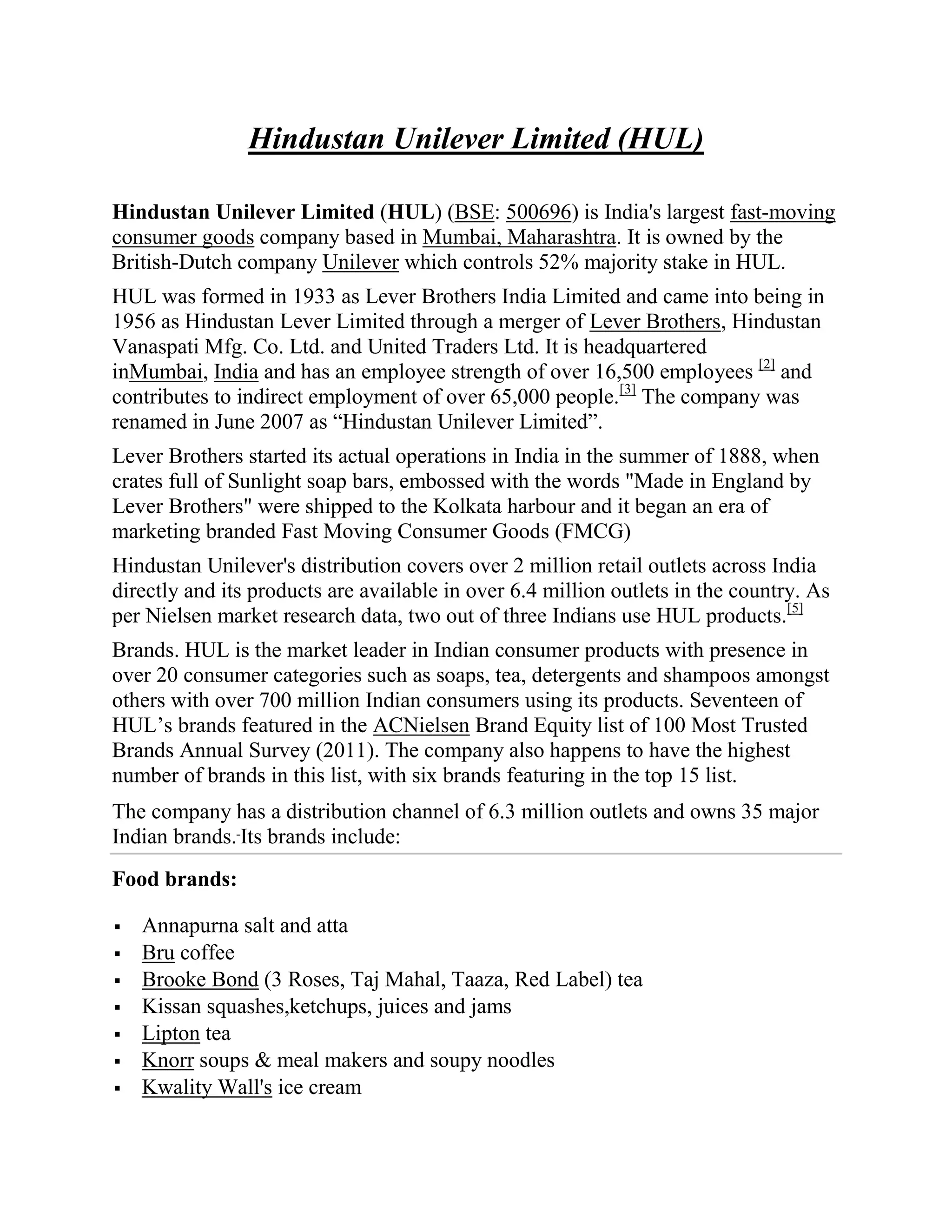 Hindustan Unilever Limited (HUL) is India's largest fast-moving consumer goods company based in Mumbai. It is owned by British-Dutch company Unilever which controls 52% of HUL. HUL was formed in 1933 and owns several major Indian brands in food, homecare, and personal care categories.