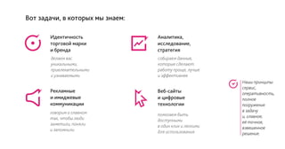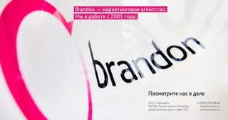 Компания Brandon, маркетинговое агентство, работает с 2005 года, предлагая услуги по брендингу, веб-дизайну и рекламным коммуникациям. Основное внимание уделяется созданию уникальных и привлекательных брендов, а также использованию аналитики для повышения эффективности работы. Агентство славится высоким уровнем обслуживания и лояльностью клиентов, с 81% повторных заказов.