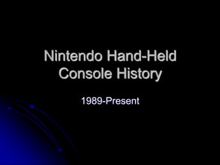 The document outlines the history of Nintendo's handheld game consoles from 1989 to 2009. It starts with the original grayscale Gameboy in 1989, which sold over 150 million units and was followed by slimmer, pocket versions and ones featuring color screens. The Gameboy Advance added additional buttons and compatibility with earlier games. Subsequent models included backlit screens for low-light play, rechargeable batteries, and size reductions to make the consoles more portable. The Nintendo DS line began in 2004 and added dual screens, compatibility with Gameboy Advance games, and with later models, brighter screens, smaller sizes, and more applications like built-in cameras and WiFi connectivity.