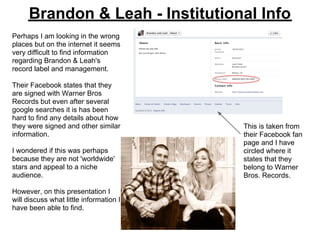 Brandon & Leah are signed with Warner Bros. Records, a major American record label founded in 1958. Warner Bros. Records has grown significantly over the decades and currently has a vast catalog of over 1 million song copyrights. The label represents a diverse range of artists across many genres. Brandon & Leah are also managed by Red Light Management, an innovative artist management company known for its entrepreneurial approach and work with both established and up-and-coming talent. Red Light Management takes a creative approach that aligns well with Brandon & Leah's artistic style.